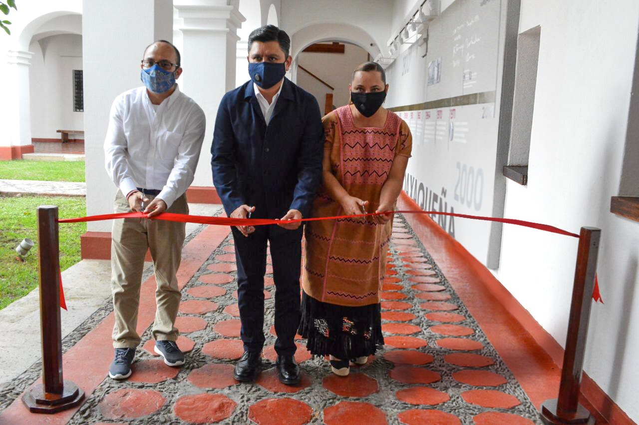 Oaxaca de Juárez, Oax. 23 de noviembre de 2020. El titular de la Secretaría de Turismo de Oaxaca, Juan Carlos Rivera Castellanos y el director general de la Casa de la Cultura Oaxaqueña (CCO), Jesús Emilio de Leo Blanco, inauguraron la reubicación de la línea del tiempo que narra la historia del Ex Convento de Santa María de los Ángeles -edificio del siglo XVII- y que ahora se alberga de manera permanente en la Galería “Monte Albán” de esta institución.