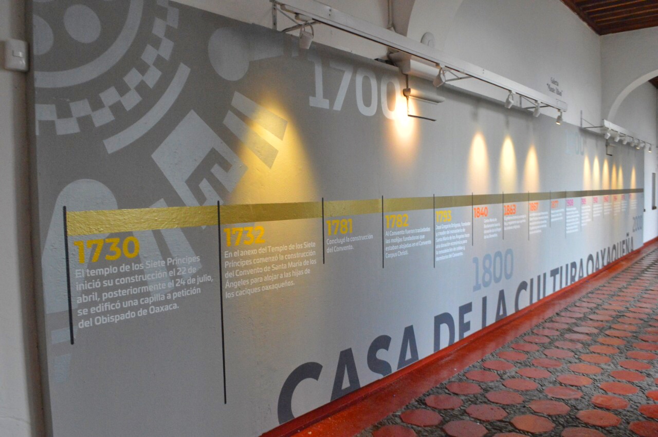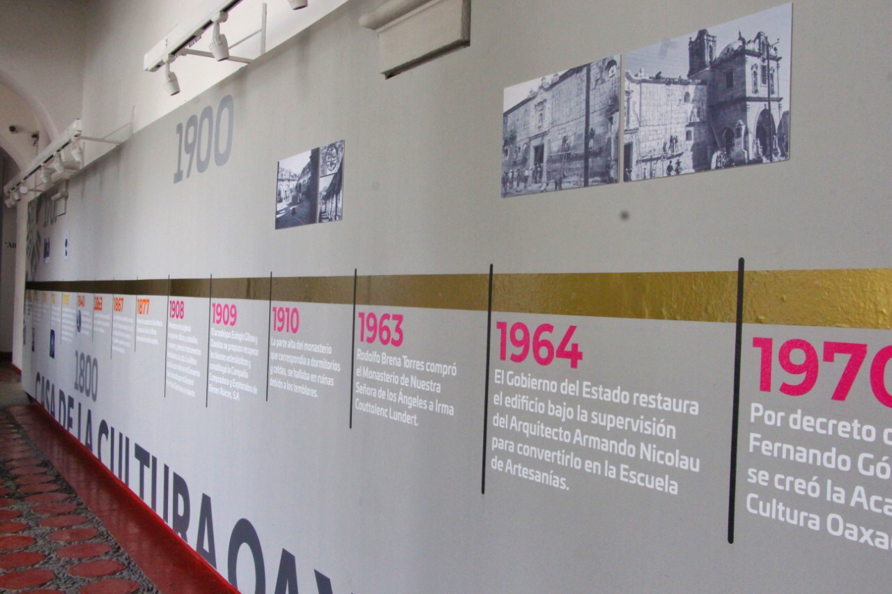 La línea del tiempo refiere los acontecimientos más importantes del edificio ubicado en el barrio de los Siete Príncipes que, durante muchos años, fue el Convento de Santa María de los Ángeles que alojó a las monjas de la orden de las capuchinas descalzas hasta convertirse en el inmueble que alberga la Casa de la Cultura Oaxaqueña desde hace 49 años.