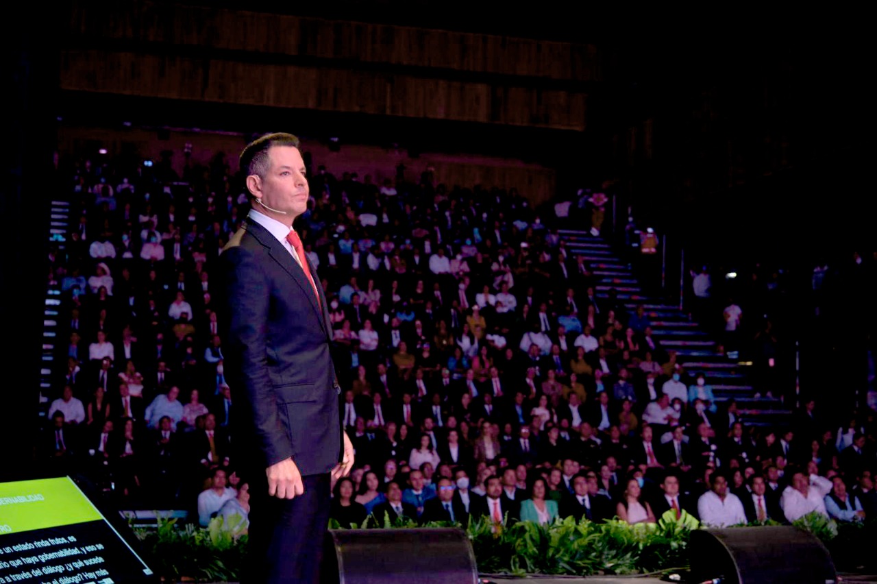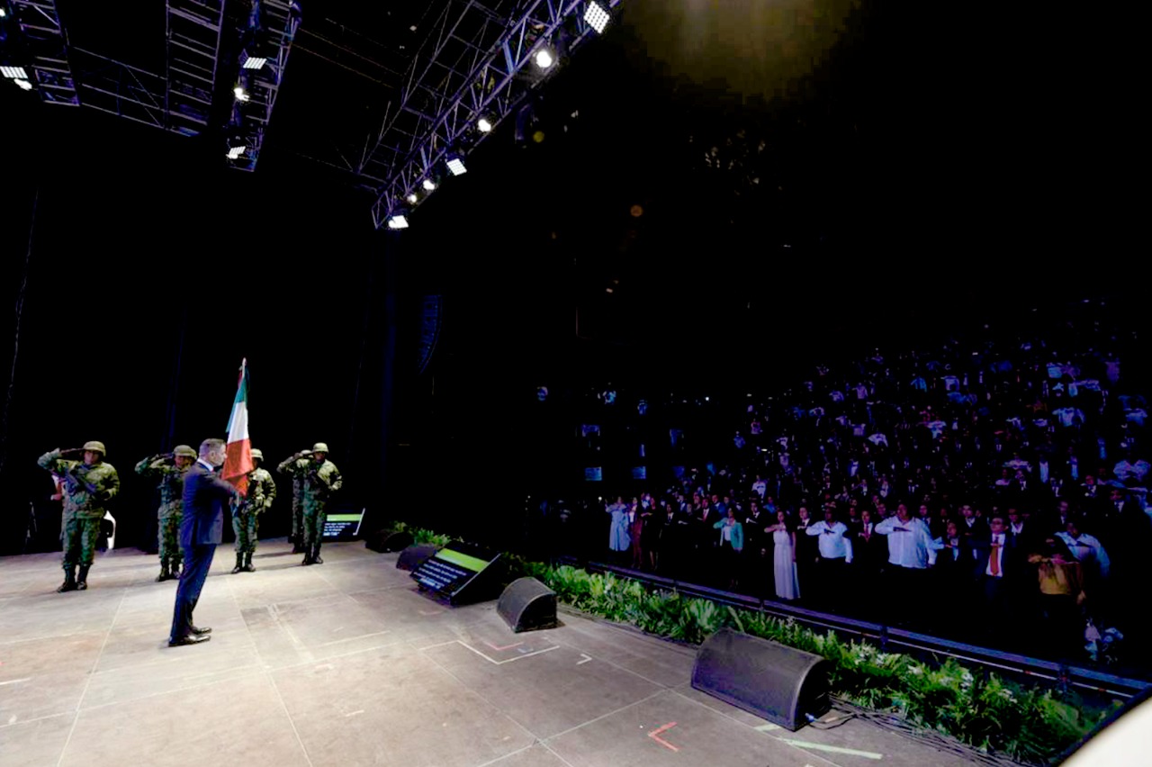 Oaxaca de Juárez, Oax., 18 de noviembre de 2022.- Teniendo como marco el recién terminado Centro Cultural “Álvaro Carrillo”, recinto para las artes cuyas características arquitectónicas y tecnología lo colocan a la altura de los mejores del país, el gobernador Alejandro Murat Hinojosa rindió ante las y los oaxaqueños su sexto informe de gobierno, en el que detalló los sueños, batallas y victorias de su Administración, que fueron posibles gracias a la confianza depositada en su proyecto y a los buenos lazos de interlocución y colaboración que se tendieron con el Gobierno Federal y los 570 municipios de la entidad.