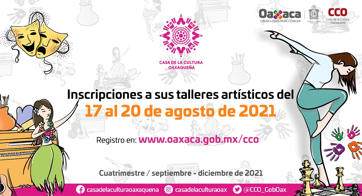 Oaxaca de Juárez, Oax. 17 de agosto de 2021. Del 17 al 20 de agosto, la Casa de la Cultura Oaxaqueña abre su proceso de inscripción en línea a sus talleres artísticos que se imparten, desde hace más de un año, en la modalidad virtual.