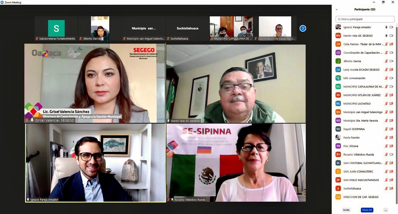 Tlalixtac de Cabrera, Oax. 10 de septiembre de 2021. La Secretaría General de Gobierno (Segego), a través de la Subsecretaría de Fortalecimiento Municipal y la Dirección de Capacitación y Apoyo a la Gestión Municipal, en coordinación con el Sistema para el Desarrollo Integral de la Familia (DIF Oaxaca), la Dirección General de Población de Oaxaca (Digepo) y el Sistema Local de Protección Integral de los Derechos de las Niñas, Niños y Adolescentes (Sipinna), impartieron la capacitación denominada «Prevención del Embarazo en Niñas y Adolescentes», en la que participaron autoridades de 30 municipios.