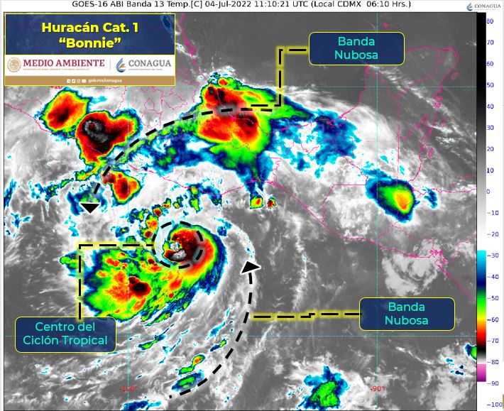 Oaxaca de Juárez, Oax. 4 de julio de 2022. La Coodinación Estatal de Protección Civil de Oaxaca (CEPCO), informa que, luego de convertirse a huracán categoría 1 en la escala de Saffir- Simpson, “Bonnie” continuará su desplazamiento paralelo a las costas de Oaxaca y Guerrero. Sus extensas bandas nubosas estarán interactuando con un canal de baja presión sobre el oriente y sureste de México, manteniendo influencia indirecta para el estado de Oaxaca, con lluvias de intensidad variable, algunas de fuertes a intensas en la Costa, Istmo, Sierra Sur, Cuenca del Papaloapan y Sierra Norte.