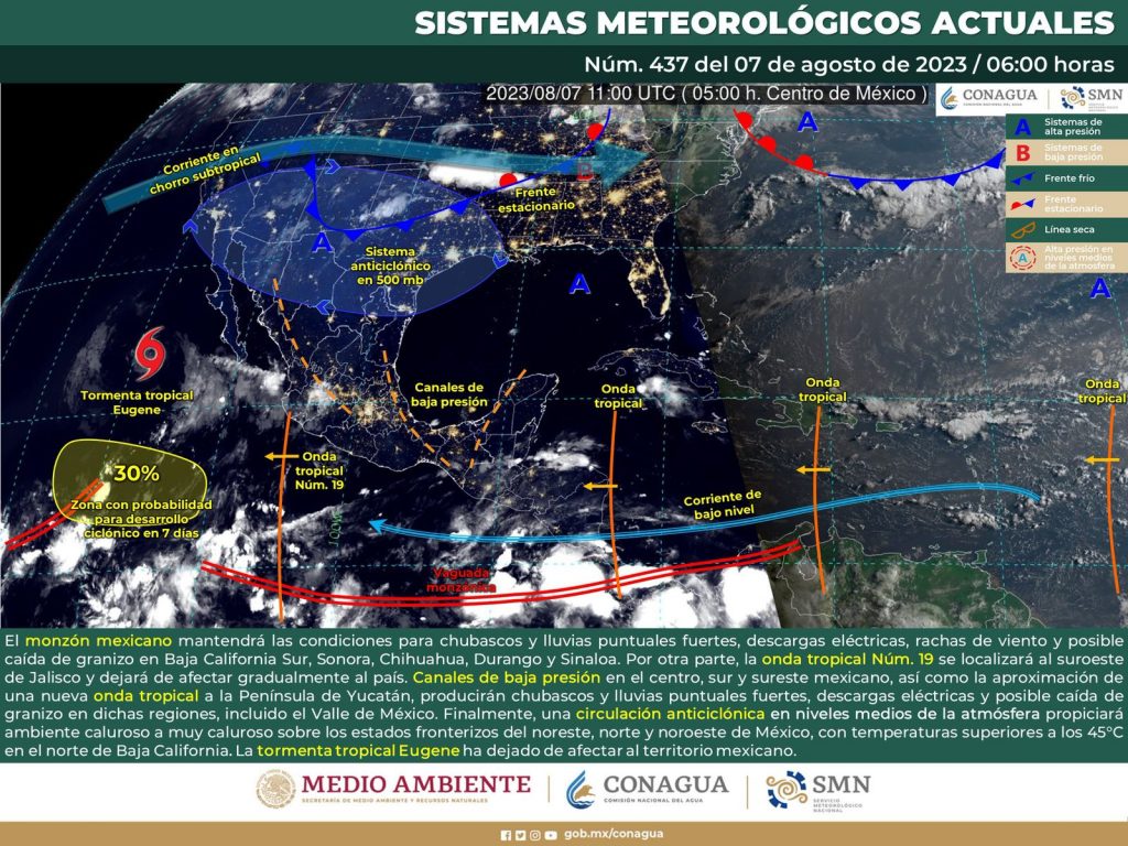 Oaxaca de Juárez, Oax. 7 de agosto de 2023.- La Coordinación Estatal de Protección Civil y Gestión de Riesgos (CEPCyGR) informa el pronóstico del tiempo emitido por la Comisión Nacional del Agua (Conagua) en el que se prevé que disminuya la intensidad de las lluvias para la tarde de este lunes, en comparación con días pasados.