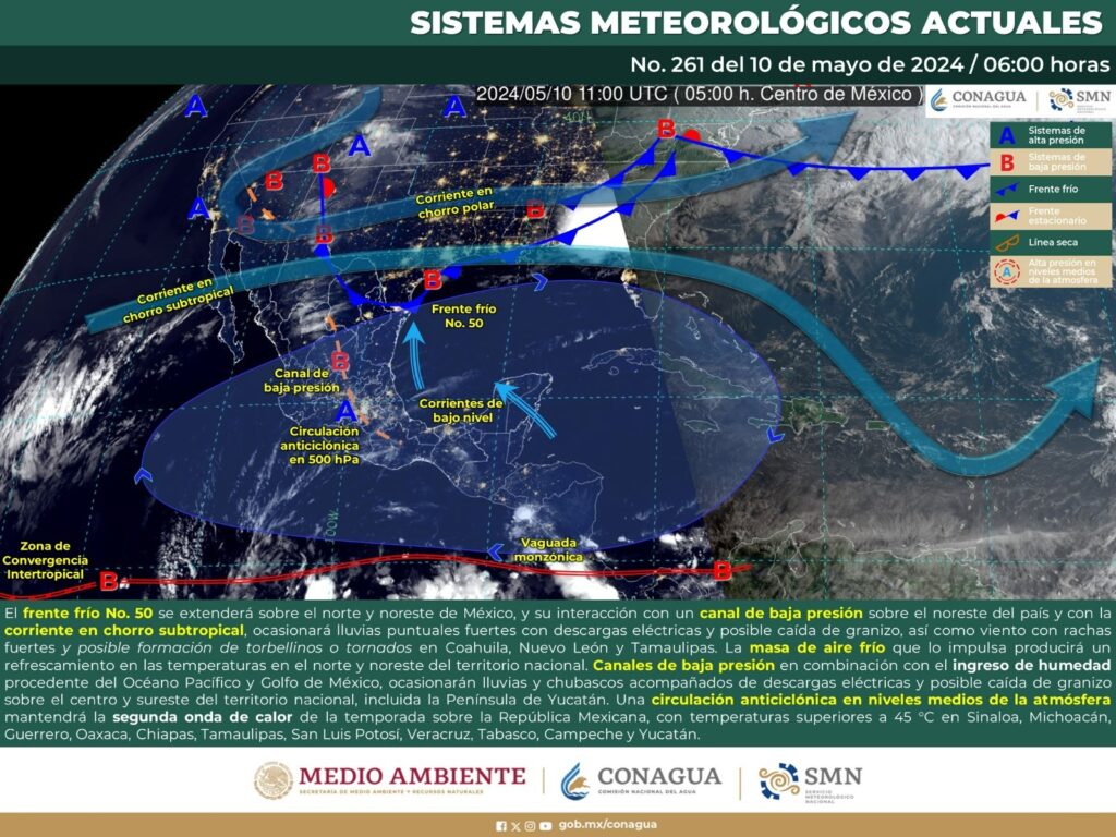 La Comisión Nacional del Agua (Conagua) también señala que un nuevo sistema frontal se mantiene semiestacionario sobre el norte de México.