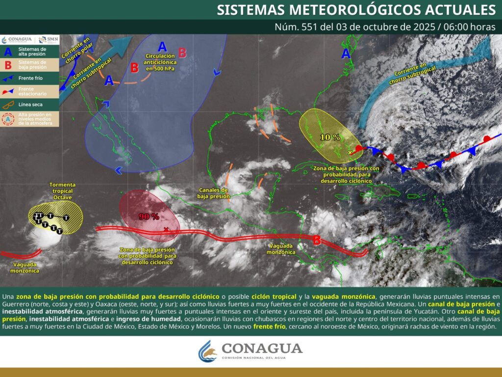 Oaxaca de Juárez, Oax. 3 de octubre de 2025.- La Coordinación Estatal de Protección Civil y Gestión de Riesgos (CEPCyGR) informa que se mantendrá el tiempo inestable con presencia de lluvias de intensidad variable en gran parte de la entidad, algunas localmente fuertes asociadas con actividad eléctrica, manteniendo rachas de viento.