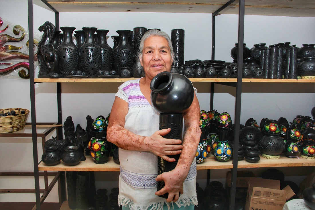Dedicada desde hace 54 años al barro negro, platica vívidamente cómo cruzaba el caudaloso río Atoyac y el agua le llegaba al pecho, para ir a vender sus cántaros a Zaachila.