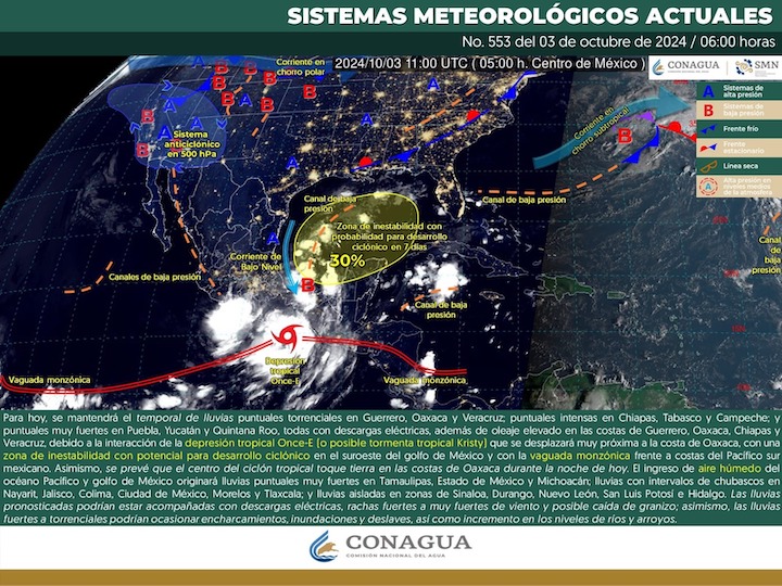 Oaxaca de Juárez, Oax. 3 de octubre de 2024.- La Coordinación Estatal de Protección Civil y Gestión de Riesgos (CEPCyGR) informa que este jueves se prevé que la Depresión Tropical Once-E evolucione a Tormenta Tropical “Kristy”, lo que mantendrá el temporal de lluvias intensas a torrenciales en las regiones del Istmo, Costa, Sierra Sur, Sierra de Juárez y Cuenca del Papaloapan; así como fuertes con ciertas intermitencias en el resto del estado.