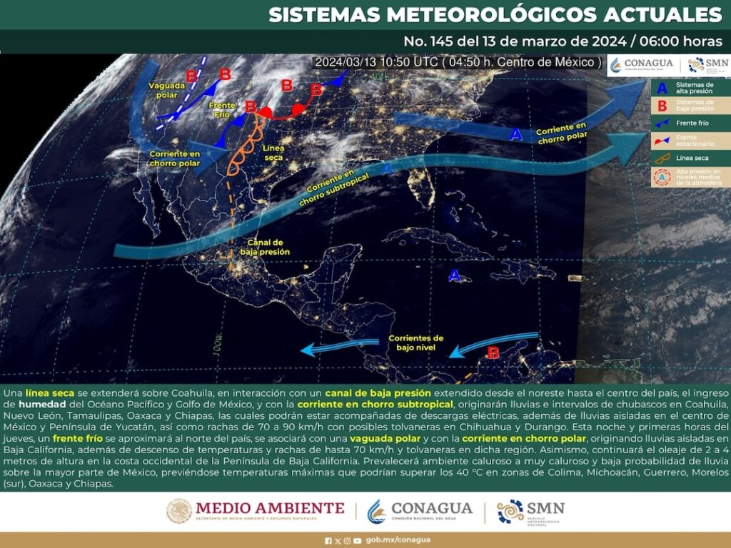 Asimismo, durante el día prevalecerá un ambiente caluroso, mientras que el viento dominante será de dirección norte y noreste de 20 a 35 km/h y rachas, principalmente en el Istmo y Golfo de Tehuantepec.