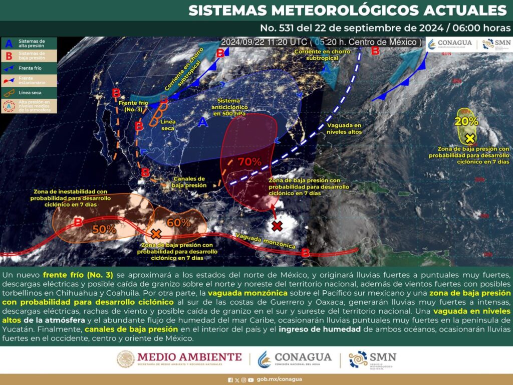De acuerdo con el pronóstico del tiempo emitido por la Comisión Nacional del Agua (Conagua), la vaguada monzónica extendida sobre el pacífico sur y una zona de inestabilidad con potencial para desarrollo ciclónico que absorberá a la onda tropical número 24 frente a la costa de Guerrero y Oaxaca, generarán inestabilidad en todo el estado con lluvias, actividad eléctrica y rachas fuertes de viento.