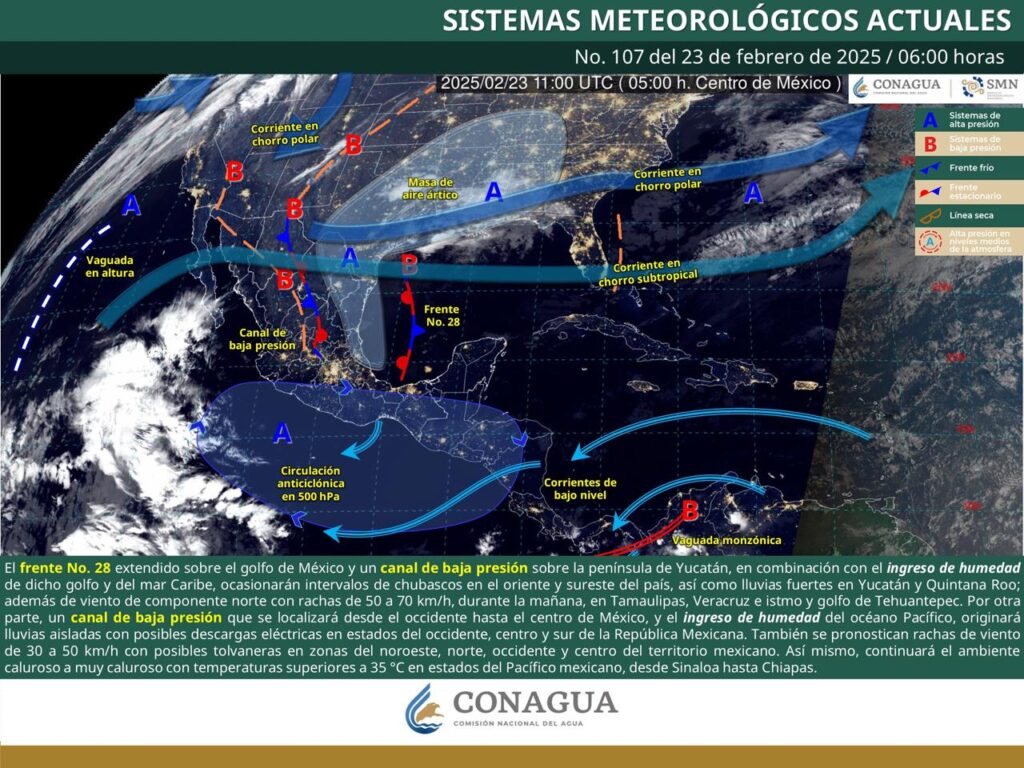 Oaxaca de Juárez, Oax. 23 de febrero de 2025.- La Coordinación Estatal de Protección Civil y Gestión de Riesgos (CEPCyGR) informa que, para este domingo el frente frío número 28 se ubica sobre el Golfo de México y sureste del país interactuando con un canal de baja presión que ocasionará algunas lluvias con chubascos aislados sin descartar algunas tormentas vespertinas en forma localizada.