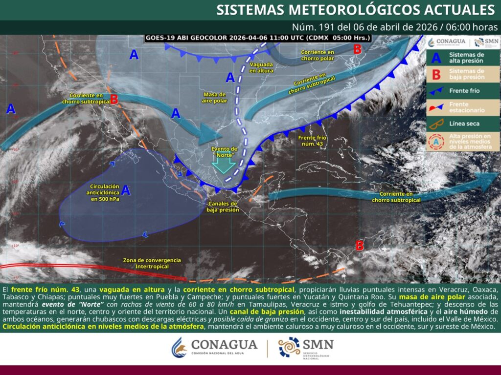 Oaxaca de Juárez, Oax., 6 de abril de 2026.- La Coordinación Estatal de Protección Civil y Gestión de Riesgos (CEPCyGR) informa que el frente frío número 43 avanzará sobre el litoral del Golfo de México y continuará ocasionando lluvias y tormentas en diferentes puntos del estado, algunas puntualmente fuertes en la mitad norte, asociadas con actividad eléctrica y posible caída de granizo, principalmente durante la tarde y noche.