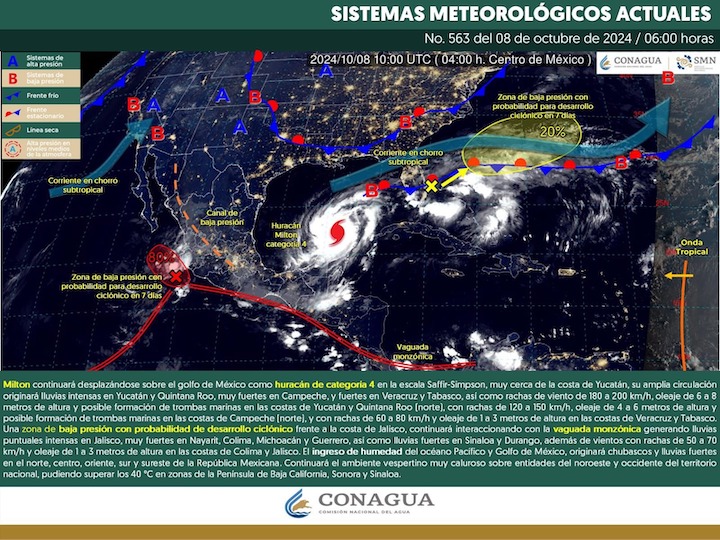 Asimismo, el poderoso huracán “Milton” de gran intensidad continuará desplazándose muy cerca y paralelo a la costa norte de la Península de Yucatán, con rumbo a la Península de Florida donde impactará entre la noche de miércoles y la madrugada del jueves.