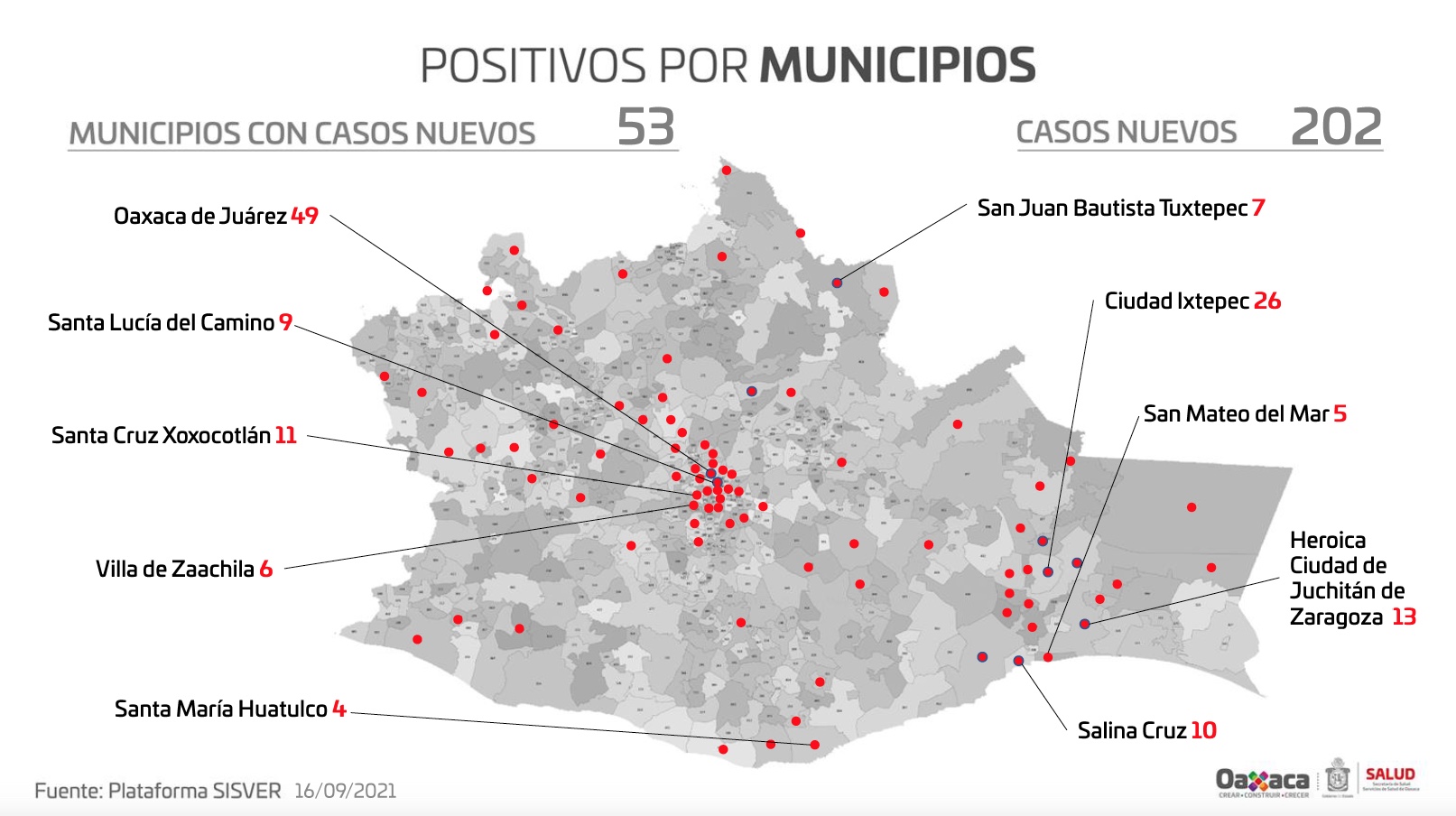 Este día 53 municipios se ven afectados con los 202 casos nuevos de COVID-19, de los cuales, Oaxaca de Juárez ocupa el primer sitio con 49, seguido de Ciudad Ixtepec con 26, Juchitán de Zaragoza con 13, Santa Cruz Xoxocotlán 11, Salina Cruz 10, Santa Lucía del Camino nueve, San Juan Bautista Tuxtepec siete, el resto de seis a un solo caso.