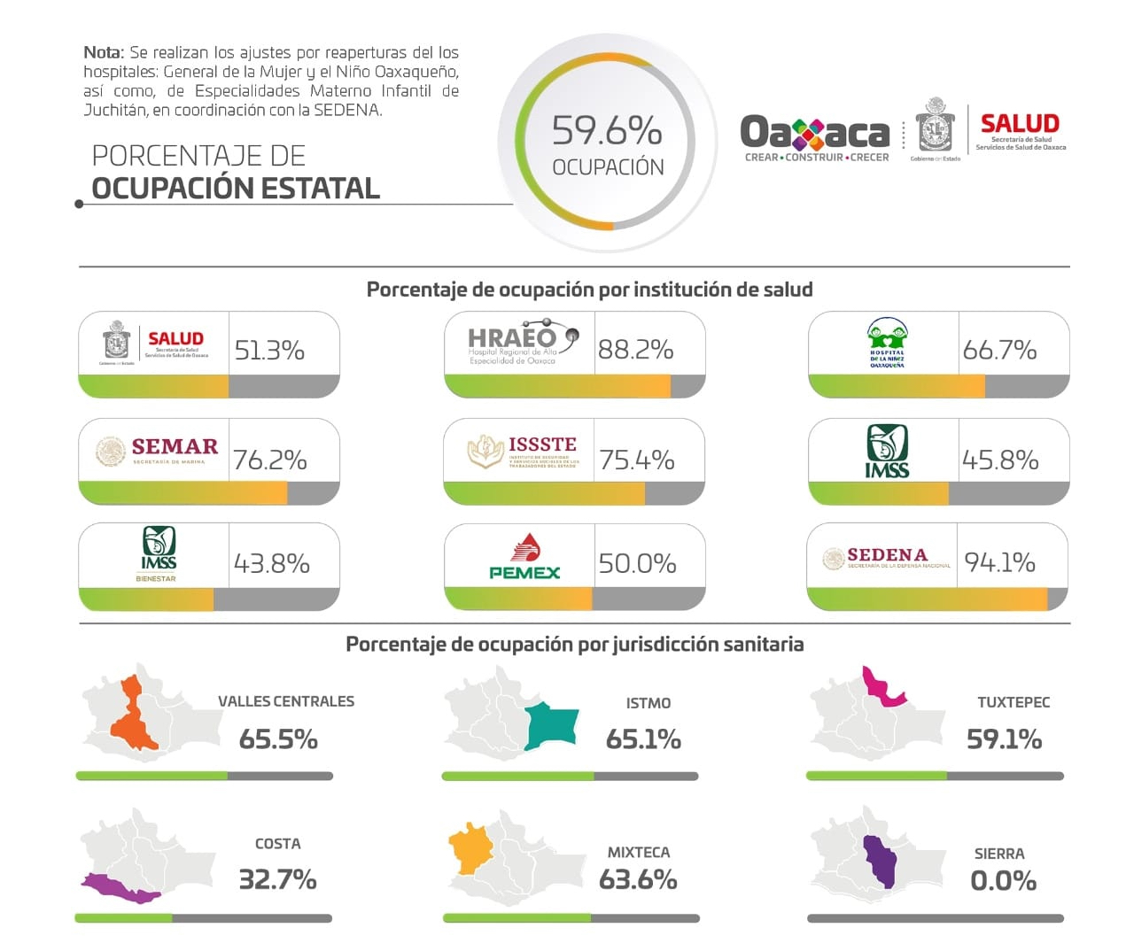 Oaxaca de Juárez, Oax., 16 de septiembre de 2021.- Durante el corte epidemiológico de este jueves, los Servicios de Salud de Oaxaca (SSO), han registrado una disminución en el porcentaje global de ocupación hospitalaria, al pasar de 76.2 por ciento- el 16 de agosto- a 59.6 por ciento, este día lo que significa una reducción del 22 por ciento.