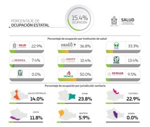 En relación a la ocupación hospitalaria, señaló que se observa un total global del 15.4, 10 casos nuevos; por Jurisdicción Sanitaria, Valles Centrales registra un 14%, Istmo 23.8%, Tuxtepec 22.9%, Costa 11.8%, Mixteca 5.9% y Sierra 0%.