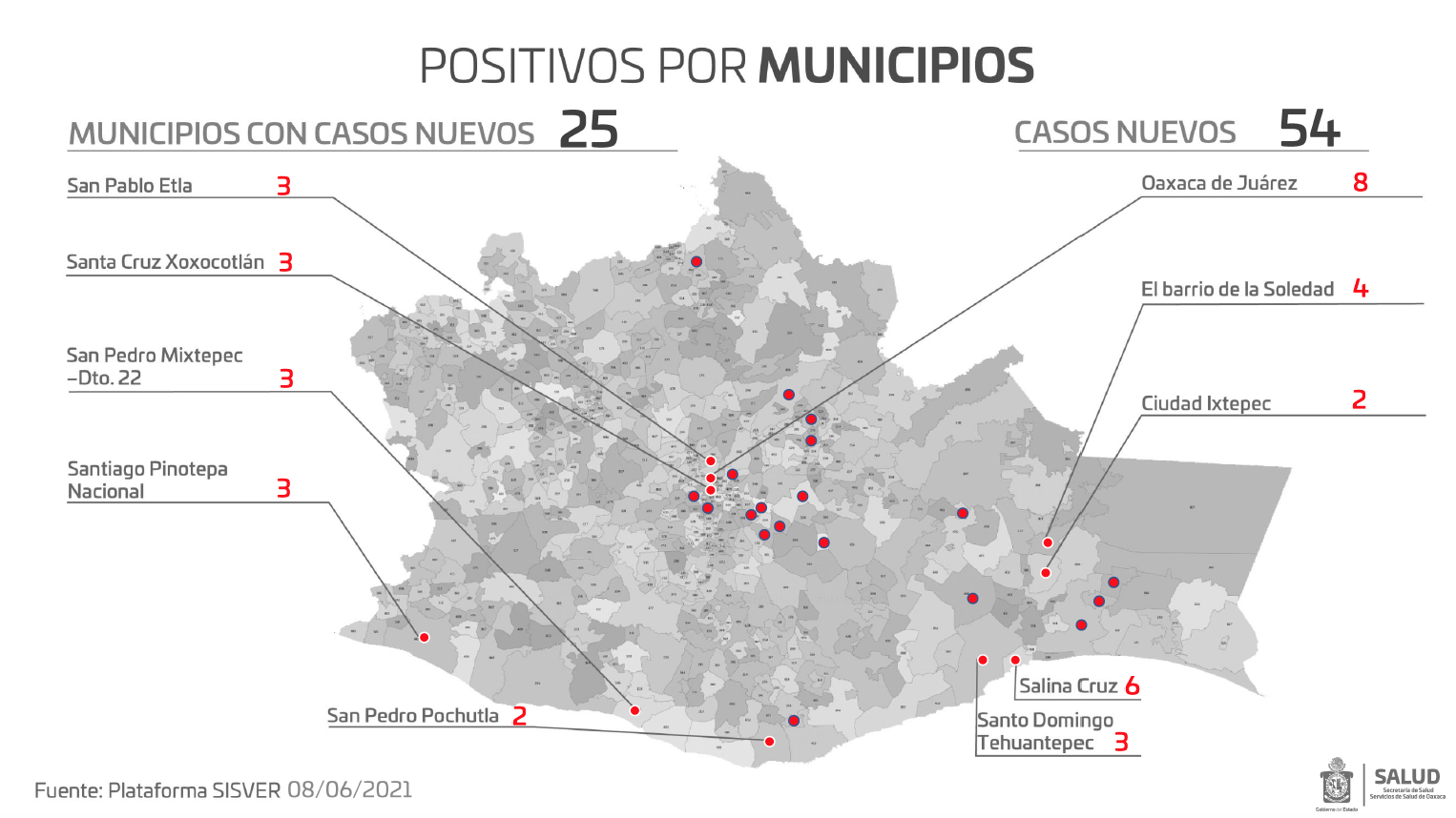 Los 54 casos nuevos de COVID-19 que se reportan este día, afectan a 25 municipios siendo el de Oaxaca de Juárez, el primer lugar con ocho casos, seguido de Salina Cruz con seis, El Barrio de la Soledad con cuatro, San Pablo Etla, San Pedro Mixtepec, Santa Cruz Xoxocotlán, Santiago Pinotepa Nacional y Santo Domingo Tehuantepec con tres cada uno, el resto dos y un caso.