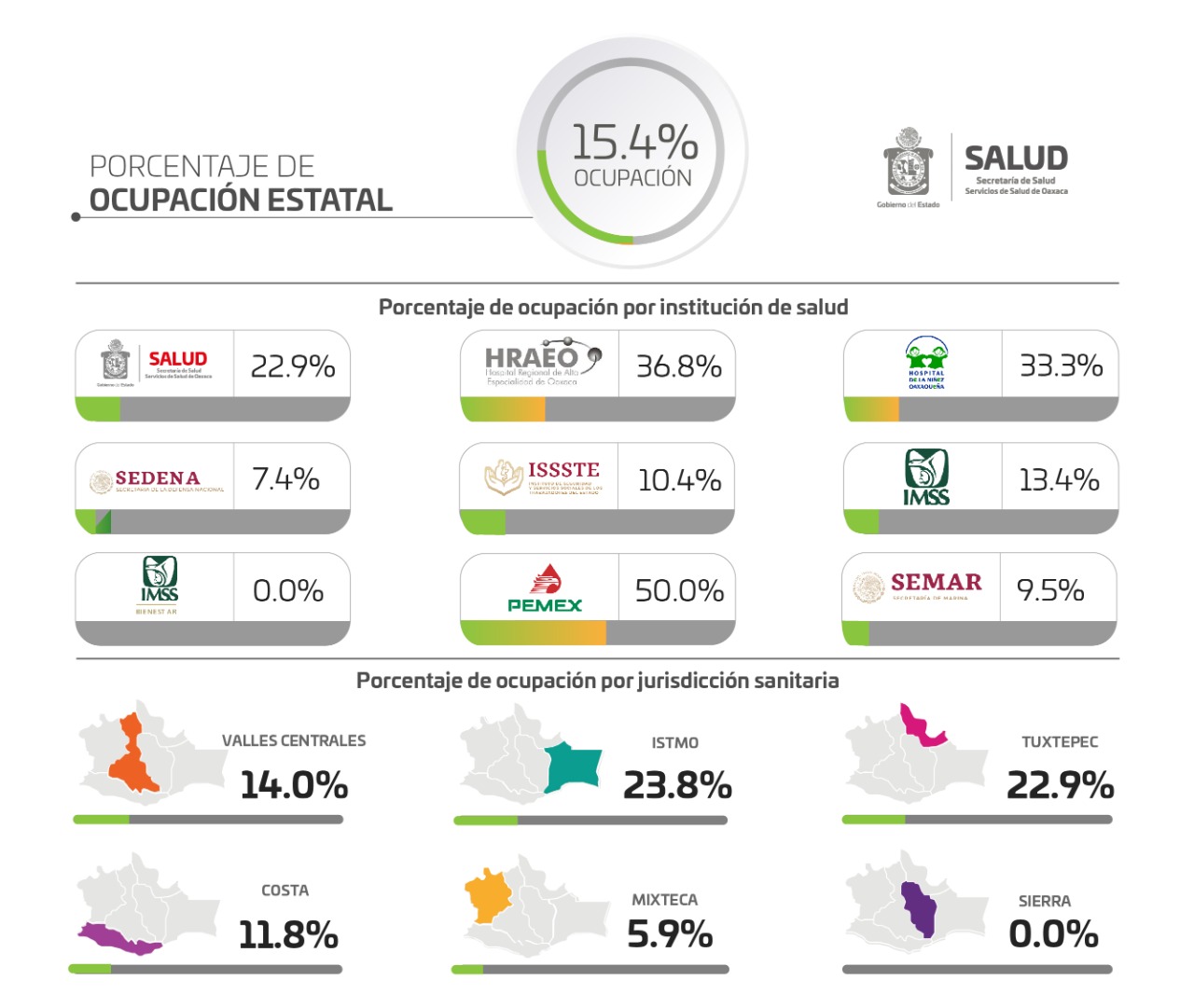 En relación a la ocupación hospitalaria, señaló que se observa un total global del 15.4, 10 casos nuevos; por Jurisdicción Sanitaria, Valles Centrales registra un 14%, Istmo 23.8%, Tuxtepec 22.9%, Costa 11.8%, Mixteca 5.9% y Sierra 0%.