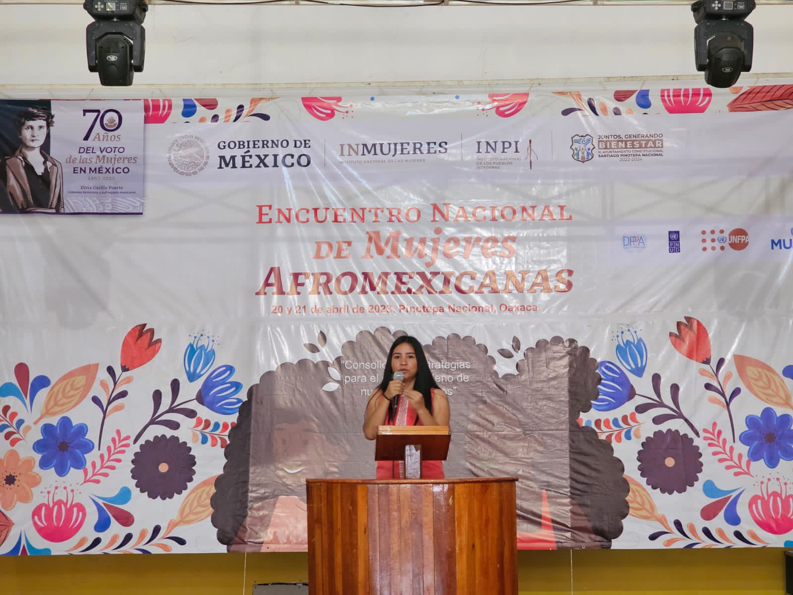 Santiago Pinotepa Nacional, Oax. 21 de abril de 2023. Con el objetivo de promover estrategias mediante el intercambio de experiencias, propiciar la reflexión y generar propuestas a favor de los derechos de las mujeres afro, la titular de la Secretaría de las Mujeres participó en el Encuentro Nacional de Mujeres Afromexicanas: consolidando estrategias para el ejercicio pleno de nuestros derechos, organizado por el Instituto Nacional de las Mujeres (Inmujeres) y el Instituto Nacional de los Pueblos Indígenas (INPI).