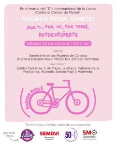 Oaxaca de Juárez, Oax. 21 de octubre de 2021. La Secretaría de las Mujeres de Oaxaca (SMO), se suma a la iniciativa del Colectivo 50+1 Capítulo Oaxaca, y junto con la Secretaría de Movilidad (Semovi), invitan a participar en la Rodada Rosa el próximo sábado 23 a las 09:00 horas, a fin de concientizar a la sociedad sobre la importancia del autocuidado de la salud y de la autoexploración mamaria, en la detección temprana del cáncer de mama, que incrementa las posibilidades de salvar la vida.
