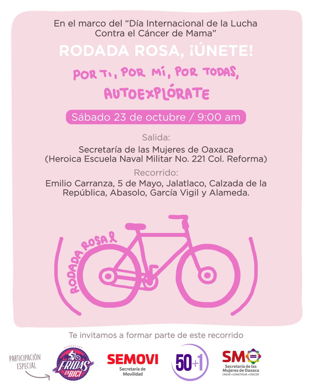 Oaxaca de Juárez, Oax. 21 de octubre de 2021. La Secretaría de las Mujeres de Oaxaca (SMO), se suma a la iniciativa del Colectivo 50+1 Capítulo Oaxaca, y junto con la Secretaría de Movilidad (Semovi), invitan a participar en la Rodada Rosa el próximo sábado 23 a las 09:00 horas, a fin de concientizar a la sociedad sobre la importancia del autocuidado de la salud y de la autoexploración mamaria, en la detección temprana del cáncer de mama, que incrementa las posibilidades de salvar la vida.