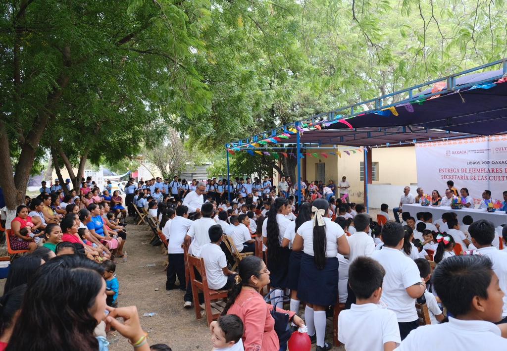 Juchitán de Zaragoza, Oax. 7 de octubre de 2023.- La Secretaría de las Culturas y Artes (Seculta) realizó la entrega de 400 ejemplares de libros a niñas y niños de la Escuela Primaria Vespertina Heliodoro Charis Castro, de la agencia Álvaro Obregón de este municipio de la región del Istmo.