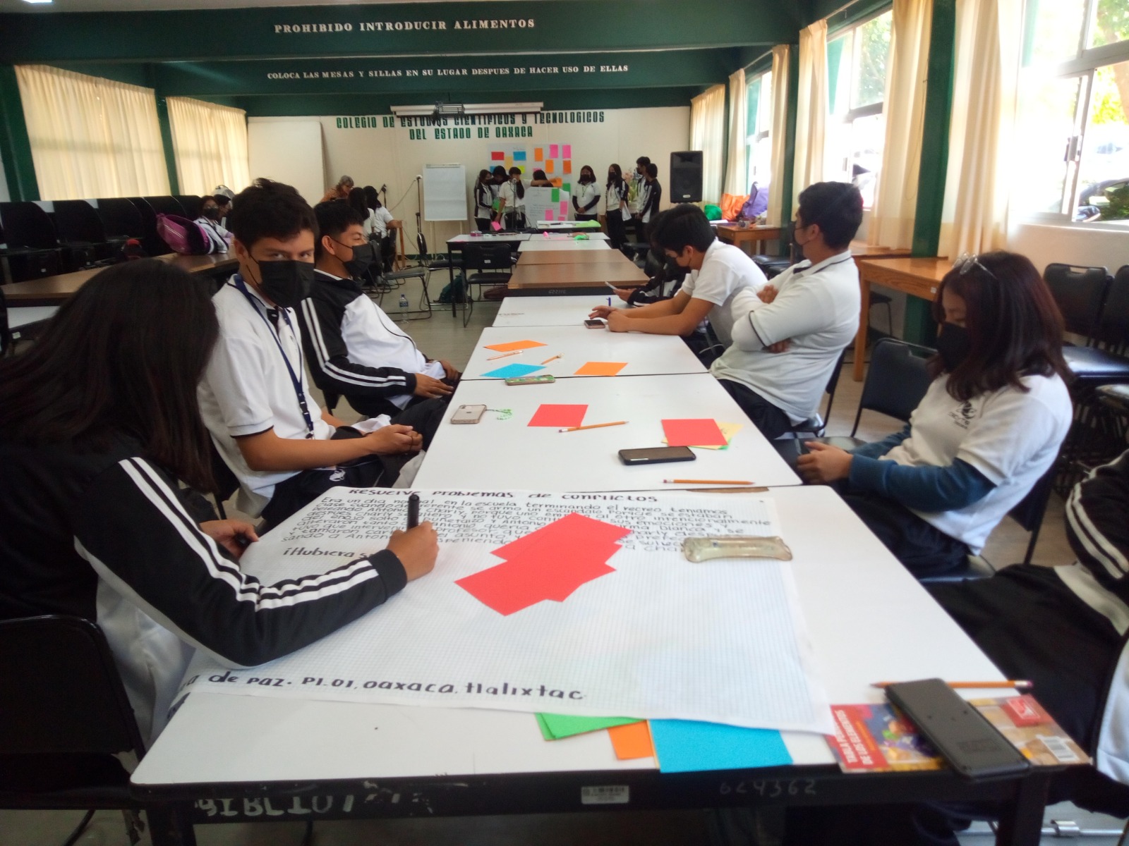 Luego de explicar los conceptos teóricos sobre el andamiaje de la Cultura de Paz, las y los jóvenes trabajaron por equipos historias sobre conflictos que vivieron o están viviendo en sus entornos y posteriormente pusieron en común las salidas no violentas en su tratamiento.