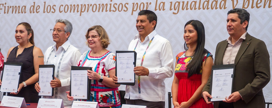 Durante el acto, el Gobierno del Estado de Oaxaca, el Inmujeres, los Poderes Legislativo y Judicial y la Fiscalía General del Estado firmaron los compromisos por la Igualdad y Bienestar de las Mujeres, los cuales convocan a trabajar en el cumplimiento de la política nacional, estatal y municipal de igualdad para el bienestar de las mujeres y niñas, el ejercicio de sus derechos y el acceso a una vida libre de violencia.