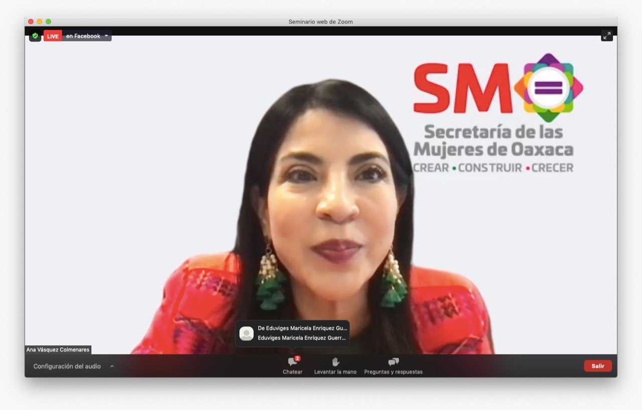 Oaxaca de Juárez, Oax. 18 de noviembre de 2021. Sin lentes violeta, sin perspectiva de género, las necesidades de las mujeres que envejecen son silenciadas, invisibilizadas, advirtió la titular de la Secretaría de las Mujeres de Oaxaca, Ana Isabel Vásquez Colmenares Guzmán durante la bienvenida a la experta en Estudios de la Mujer, Nancy Lysvet Flores Castillo quien dictó la conferencia virtual ‘Envejecimiento consciente: reflexiones en torno al proceso de envejecer como mujeres.
