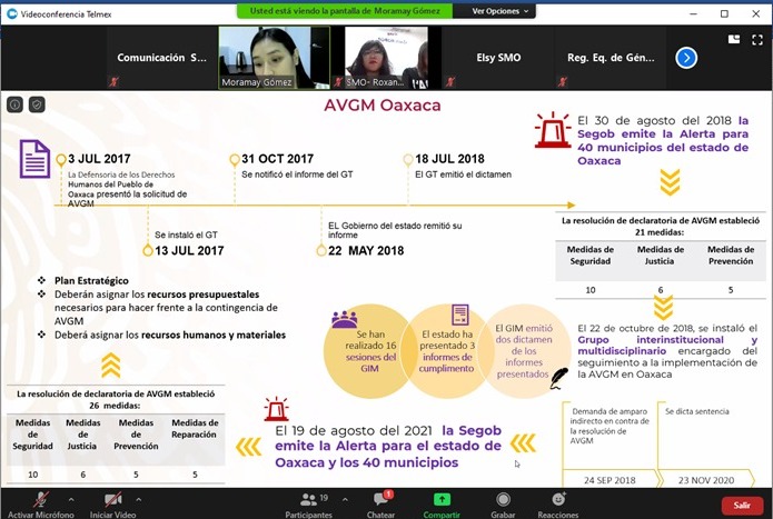 Oaxaca de Juárez, Oax. 8 de septiembre de 2022. La Secretaría de las Mujeres de Oaxaca (SMO) impartió de forma virtual la “Capacitación a municipios con Alerta de Violencia de Género contra las Mujeres (AVGM) para sus informes 2021-2022” a representantes de los 40 Ayuntamientos con Declaratoria y la cual estuvo a cargo de personal de la Comisión Nacional para Prevenir y Erradicar la Violencia contra las Mujeres (Conavim).