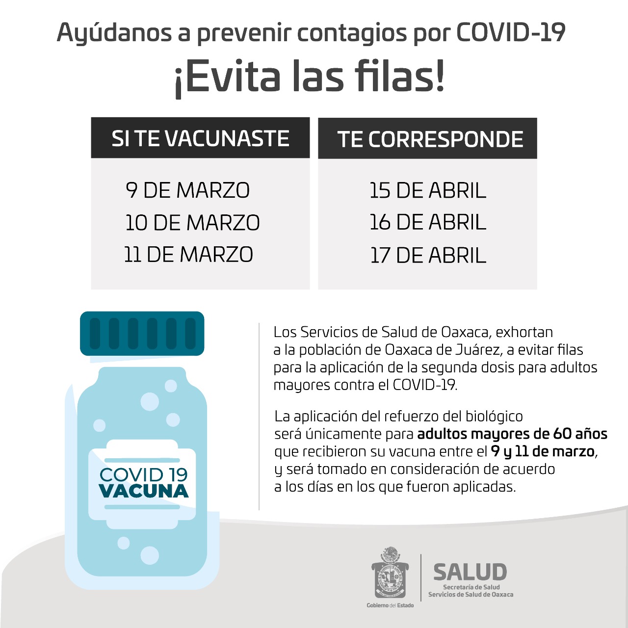 Oaxaca de Juárez, Oax. 13 de abril de 2021.- Los Servicios de Salud de Oaxaca (SSO), exhortan a la población de Oaxaca de Juárez, evitar filas o aglomeraciones para la aplicación de la segunda dosis de vacunas para personas adultas mayores contra la COVID-19.