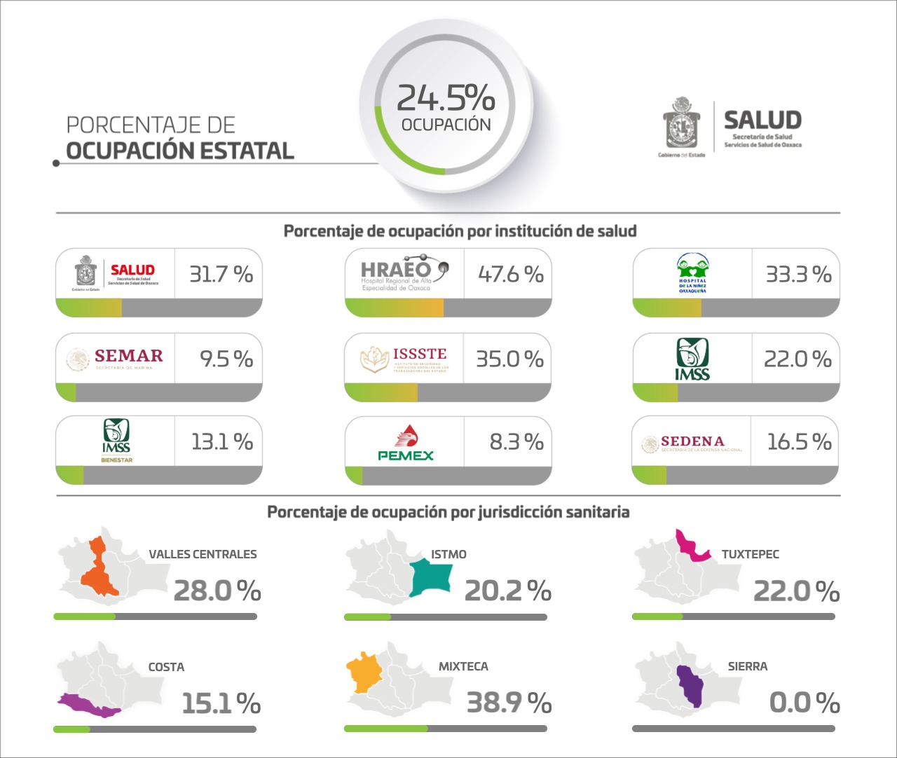 Reveló que, hasta este martes, hay 146 pacientes hospitalizados, 24 son de nuevo ingreso, por lo que la ocupación hospitalaria se encuentra al 24.5% de manera general; cinco nosocomios se encuentran al 100% de su capacidad.