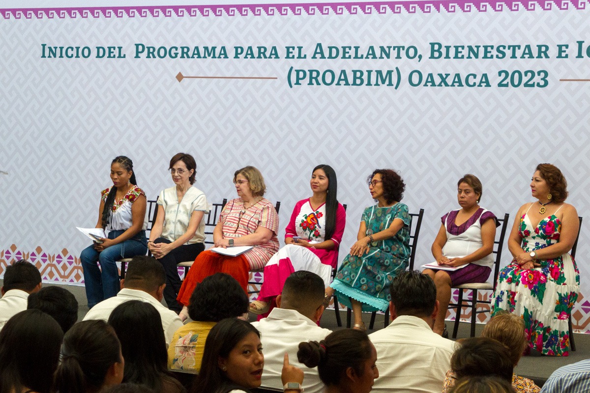 En el inicio del PROABIM estuvieron presentes las secretarias de Educación en Oaxaca Delfina Elizabeth Guzmán Díaz; de Movilidad Claudina de Gyves Mendoza; de Bienestar, Tequio e Inclusión Laura Estrada Mauro.