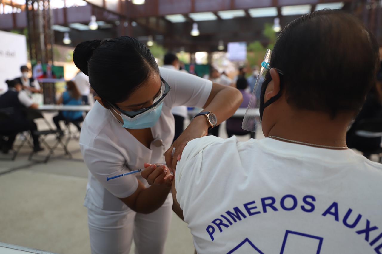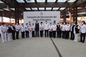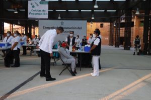Como parte de las acciones emprendidas con motivo del Plan Nacional de Vacunación, el Mandatario Estatal informó desde uno de los 22 centros de vacunación, ubicado en el Centro de Convenciones de Santa Lucía del Camino, que se vacunarán docentes de educación inicial, media y superior de la entidad, con el apoyo de mil 92 elementos, de los cuales 340 pertenecen a la Guardia Nacional, 22 son Coordinadores de Centros de vacunación, 730 conforman las Brigadas Correcaminos y delegados Bienestar.