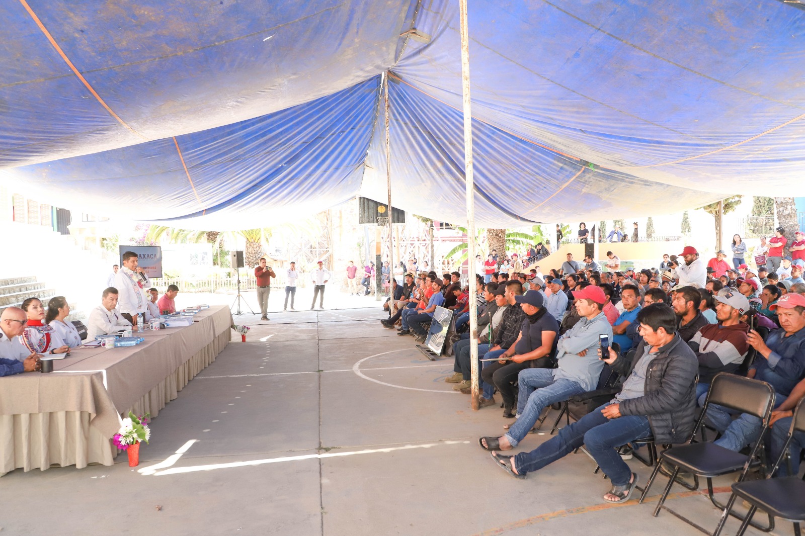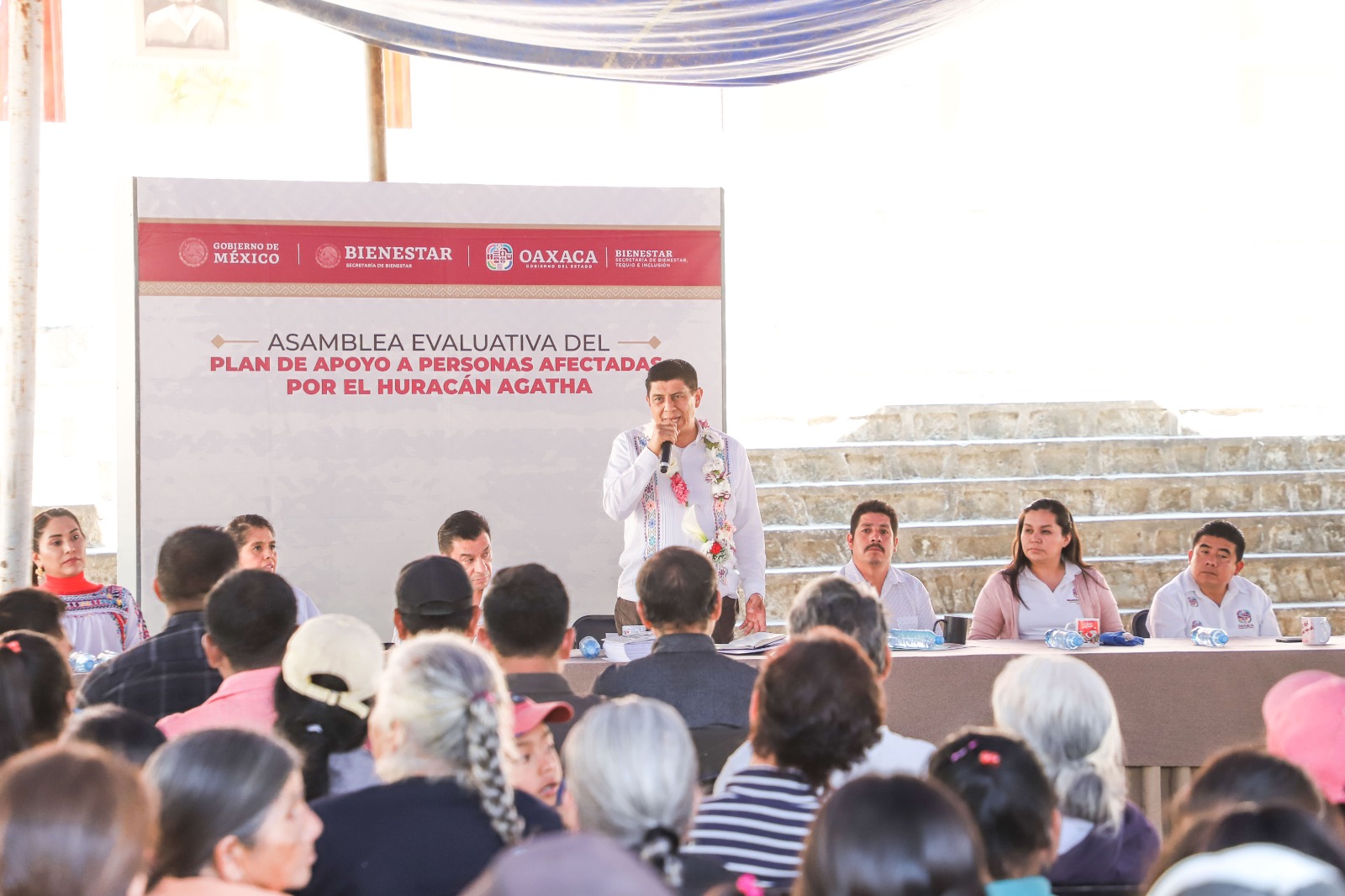 En San Francisco Ozolotepec, acompañado por el edil Guillermo Gallardo Figueroa, Jara Cruz encabezó la Asamblea Evaluativa para conocer las acciones realizadas con los 50 millones de pesos destinados a atender las afectaciones causadas por el huracán.