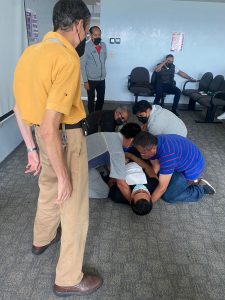 El personal del Departamento de Seguridad y Gestión Integral de Riesgo explicó a hombres y mujeres las fases a seguir para una evacuación segura y cómo actuar con personas lesionadas durante el inminente peligro de la emergencia, esto al fungir como primer respondiente.