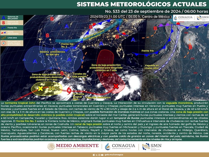 De acuerdo con el pronóstico del tiempo emitido por la Comisión Nacional del Agua (Conagua), todo esto es originado por la tormenta tropical John que se ubicó esta madrugada a 260 kilómetros al suroeste de Puerto Ángel, Oaxaca y que seguirá muy próximo a la costa, inmerso en la vaguada monzónica conjunto a una zona de inestabilidad con potencial para desarrollo ciclónico en el noroeste del Mar Caribe.