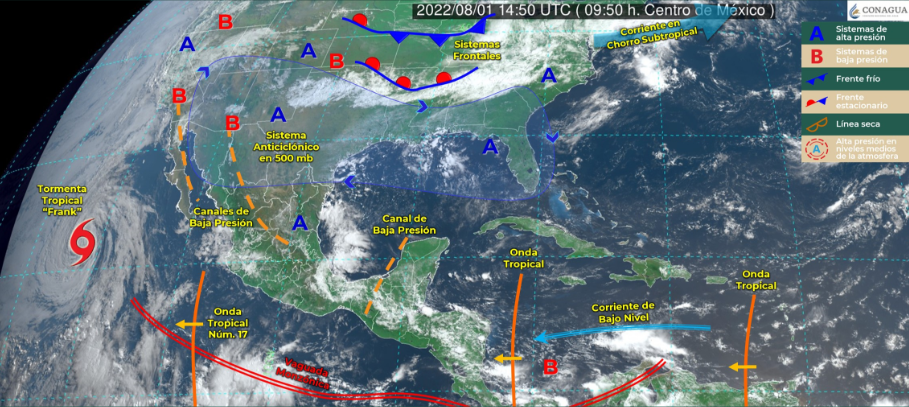 Por otra parte, la CEPCO dio a conocer que se mantiene vigilancia de una onda tropical con convección dispersa sobre Panamá, que se desplaza hacia el oeste, con posible ingreso en las próximas 48 horas sobre el sureste de México.