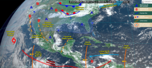 • Se mantiene vigilancia de una onda tropical con convección dispersa sobre Panamá, que se desplaza hacia el oeste, con posible ingreso en las próximas 48 horas sobre el sureste de México
