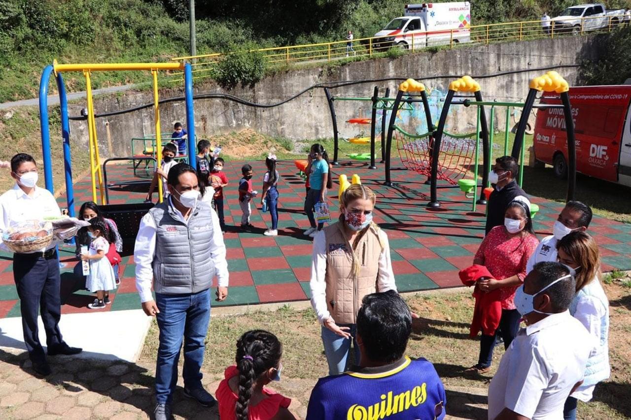 Niñas, niños y adolescentes tienen derecho al esparcimiento, al juego y a las actividades recreativas propias de su edad, por lo que satisfacer estas necesidades es prioridad para la administración que encabeza el gobernador Alejandro Murat Hinojosa. Por esta razón, y siguiendo los protocolos de salud derivado del covid-19, la presidenta honoraria del Sistema para el Desarrollo Integral de la Familia (DIF) del Estado de Oaxaca, Ivette Morán de Murat, entregó un parque infantil incluyente en Villa Talea de Castro, región de la Sierra Norte. Dicho parque tuvo una inversión superior a los 470 mil pesos.