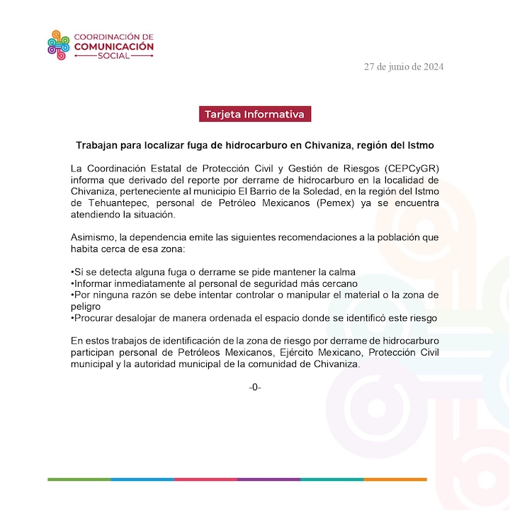 La Coordinación Estatal de Protección Civil y Gestión de Riesgos (CEPCyGR) informa que derivado del reporte por derrame de hidrocarburo en la localidad de Chivaniza, perteneciente al municipio El Barrio de la Soledad, en la región del Istmo de Tehuantepec, personal de Petróleo Mexicanos (Pemex) ya se encuentra atendiendo la situación.