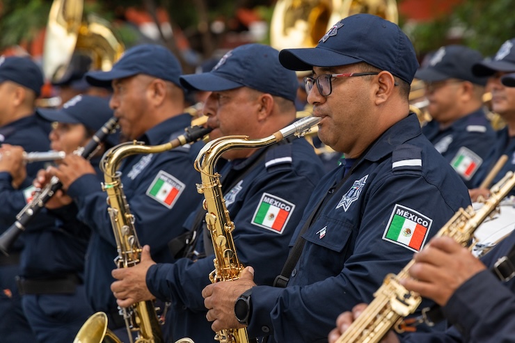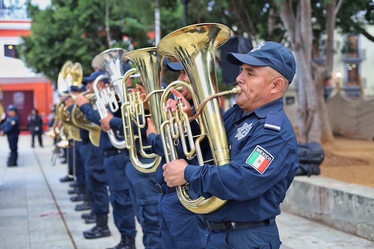 En esta actividad enmarcada en el 214 aniversario de la Independencia de México, la Banda de Guerra y la Banda de Música de la Secretaría de Seguridad y Protección Ciudadana (SSPC) interpretaron el Himno Nacional acompañados por las voces de Luis Ricardo Juárez Ruiz y Yesenia Osorio Martinez ,la Marcha Cadetes de la Naval, así como los Honores de retirada del Lábaro Patrio.