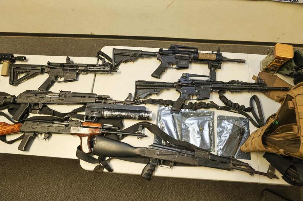 Adicionalmente, se incautó equipo táctico consistente en kits de chalecos balísticos, fornituras, cargadores abastecidos y un par de esposas.