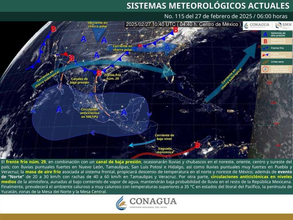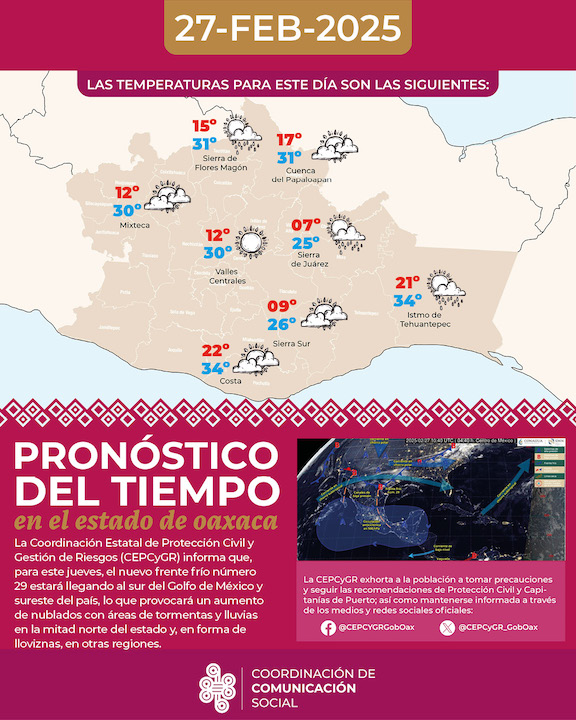 Oaxaca de Juárez, Oax. 27 de febrero de 2025.- La Coordinación Estatal de Protección Civil y Gestión de Riesgos (CEPCyGR) informa que, para este jueves, el nuevo frente frío número 29 estará llegando al sur del Golfo de México y sureste del país, lo que provocará un aumento de nublados con áreas de tormentas y lluvias en la mitad norte del estado y, en forma de lloviznas, en otras regiones.