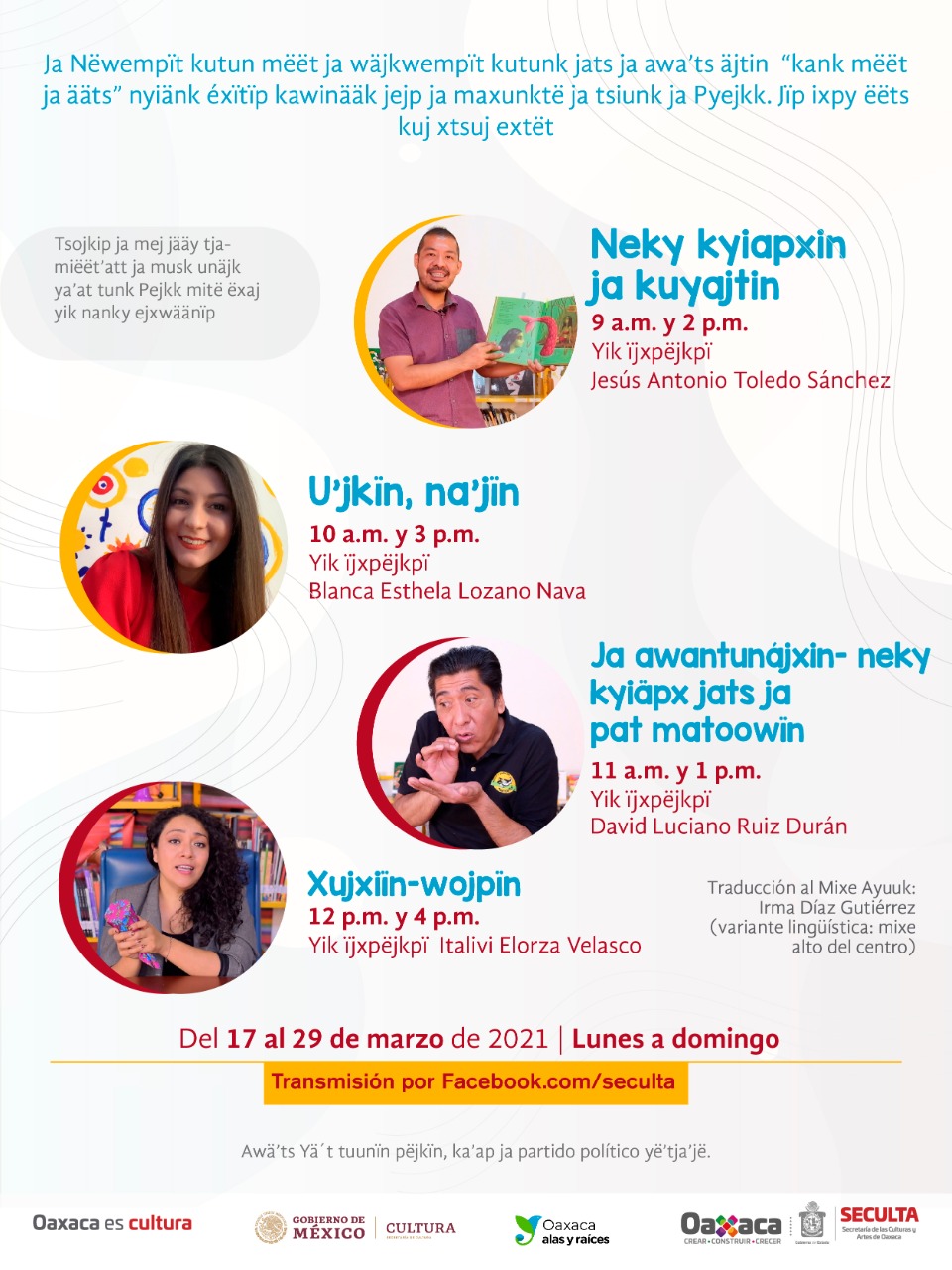 Oaxaca de Juárez, Oax. 18 de marzo de 2021.- Como parte del Programa de Desarrollo Cultural Infantil «Alas y Raíces”, que tiene como objetivo acciones destinadas al cumplimiento de los derechos culturales de las infancias -de 0 a 17 años de edad-; la Secretaría de las Culturas y Artes de Oaxaca (Seculta) cumple con el compromiso de impulsar actividades para la Primera Infancia en Oaxaca a través de diversas actividades que se realizan en lengua Mixe.