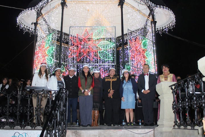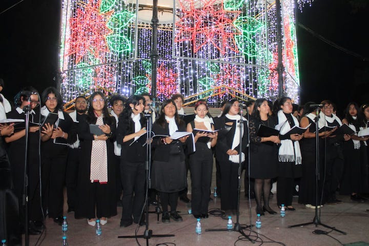 El Quiosco iluminado de la capital oaxaqueña fue el escenario para que el Coro de la institución universitaria, bajo la dirección del maestro Abdías Cruz López, interpretara diversas melodías como Veni, Veni Emmanuel, Cantique de Noël y We Three Kings, entre otras.