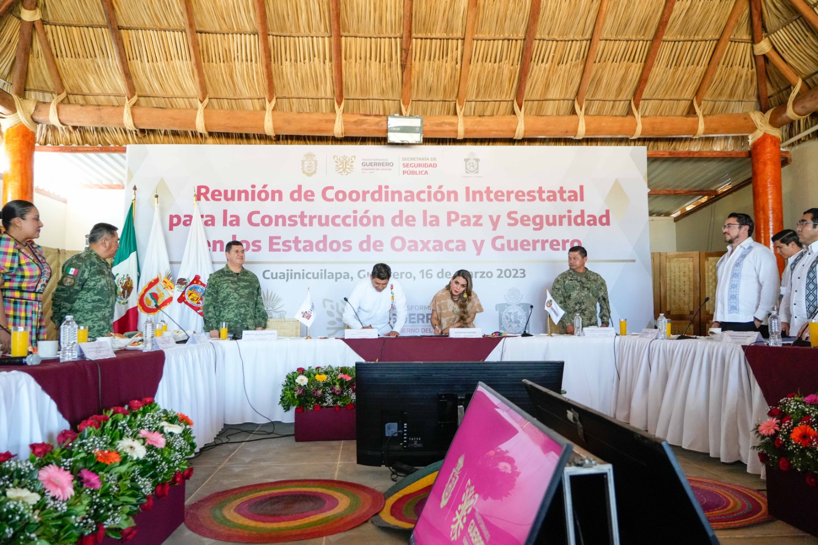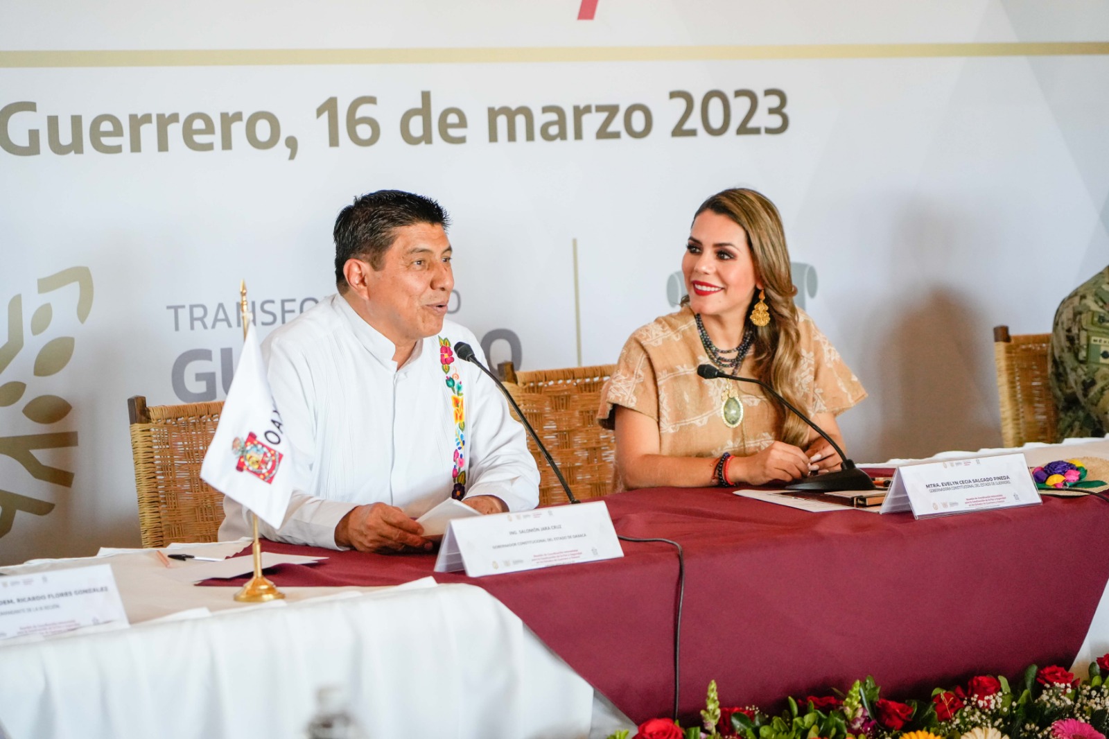 Cuajinicuilapa, Gro. 16 de marzo de 2023. El Gobernador de Oaxaca, Salomón Jara Cruz y su homóloga del estado de Guerrero, Evelyn Salgado Pineda, firmaron un Convenio de Colaboración Interestatal para la Construcción de la Paz y Seguridad entre ambos estados.