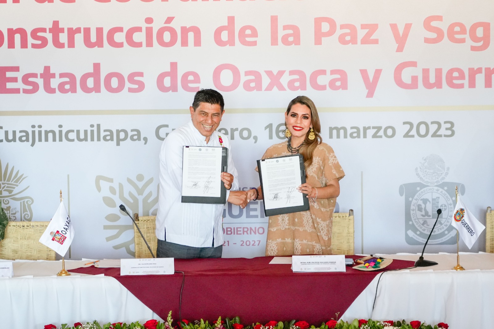 • El Gobernador de Oaxaca Salomón Jara Cruz y su homóloga del estado de Guerrero, Evelyn Salgado, signaron convenio de colaboración para fortalecer las acciones en materia de seguridad pública