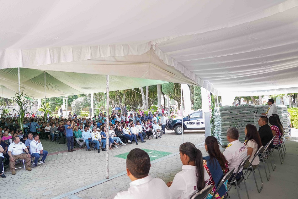Como parte de este esquema denominado Pueblo y maíz, misma raíz con el que se busca cubrir mil 52 hectáreas en esta zona, se entregaron a 550 personas productoras un sacó de semillas mejoradas, seis bultos de fertilizantes por hectárea y un paquete de bioinsumos para combatir plagas y producir al menos cinco mil toneladas de maíz.