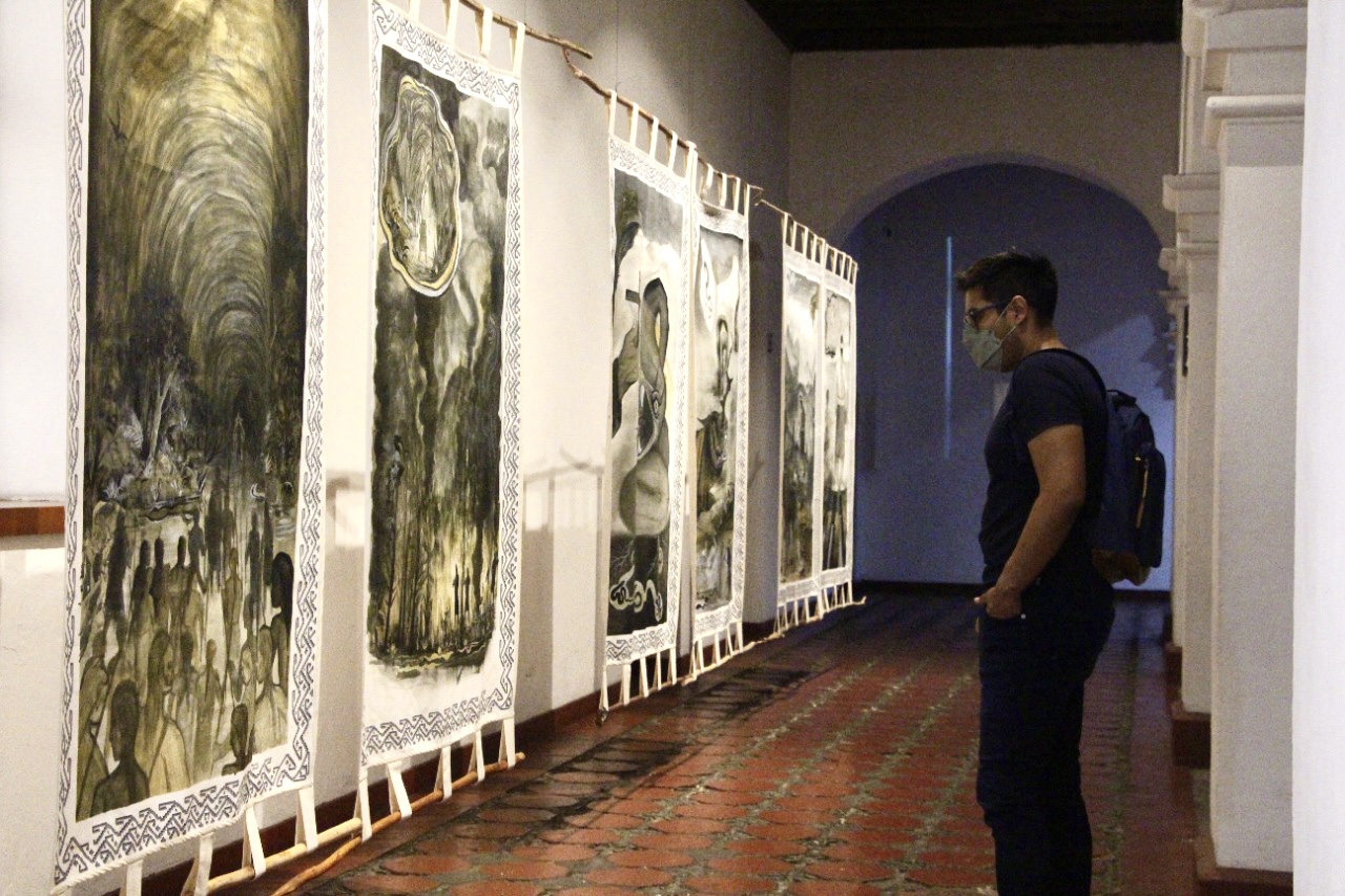 Esta muestra, compuesta de una serie pictórica de 20 paneles verticales que representan las escenas del mito mixe y un tótem de escala monumental, formó parte de la serie de exhibiciones del proyecto artístico Hacer Noche y que contó con la curaduría de Elvira Dyangani Ose, quien es directora del MACBA.