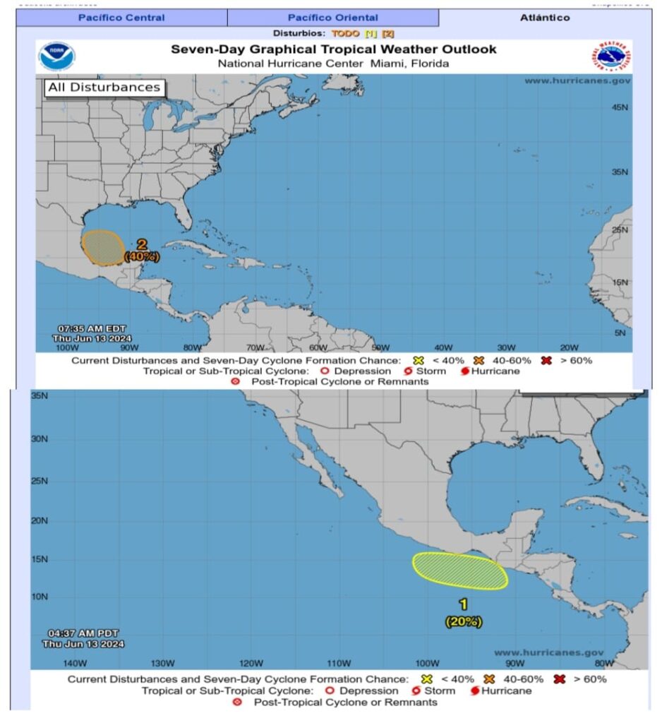 De acuerdo con información emitida por el Centro Nacional de Huracanes (NHC), se vigilan dos amplias zonas de baja presión, la primera al suroeste del Golfo de México y la segunda en el Pacífico Sur, las cuales tienen un 40 y 20 por ciento respectivamente, de probabilidad de evolucionar a ciclón tropical en los próximos 7 días.